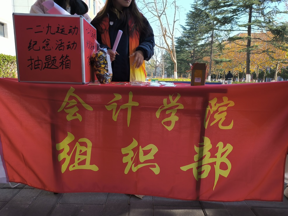 首先是纪念一二·九运动的答题活动。会计学院在校内户外场所设置了答题区域,让同学们通过答题的方式了解一二·九运动的相关英雄人物与事迹,启示青年铭记历史,发扬英勇斗争、坚定不屈的精神,努力学习科学文化知识,为祖国建设出力。