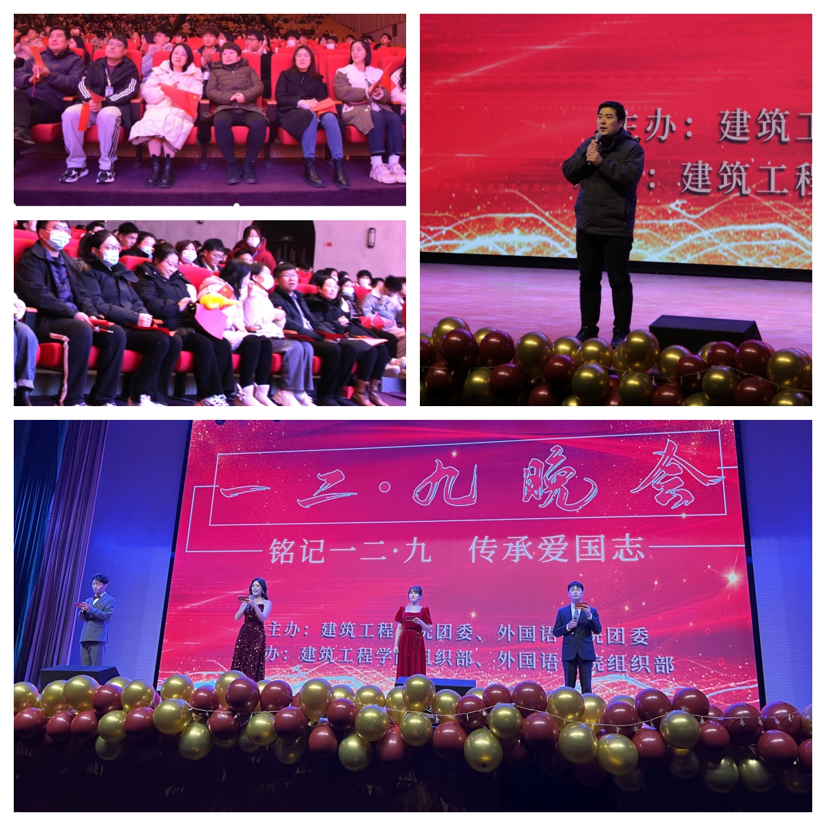 12月13日,建工学院、外语学院团委在思源会馆联合举办“铭记一二·九,传承爱国志”一二·九红色晚会。出席本次晚会的嘉宾有校团委副书记李雷、外语学院党委书记石皓召、建工学院副院长高燕、校团委宣传部负责人马鹏、校团委社团文体部负责人马悦、会计学院团委书记陈刚、外语学院团委书记丁玥、建工学院团委书记支园园以及两个学院部分辅导员老师。