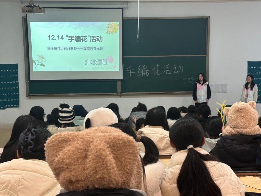 为了活跃校园文化氛围,引导学生更多地关注自身的心理健康,充分展现会计学院学子的风采,会计学院心航路社团于12月14日在教学楼4号楼118教室举办了“手编花”活动。