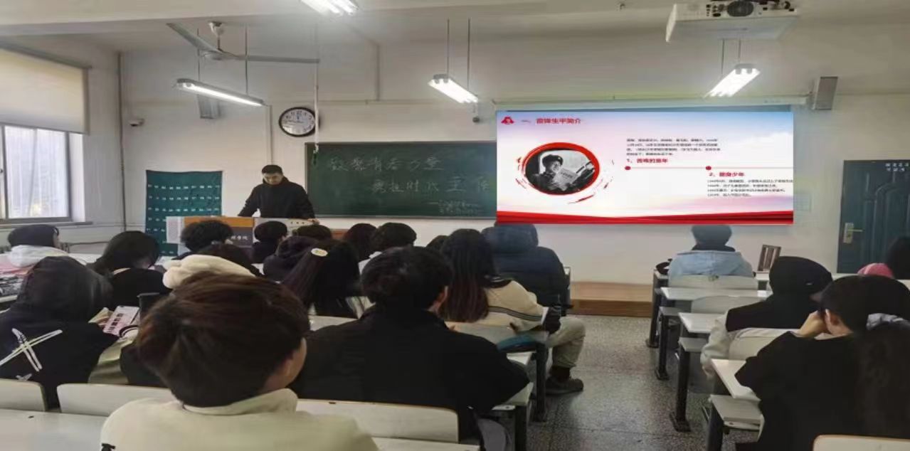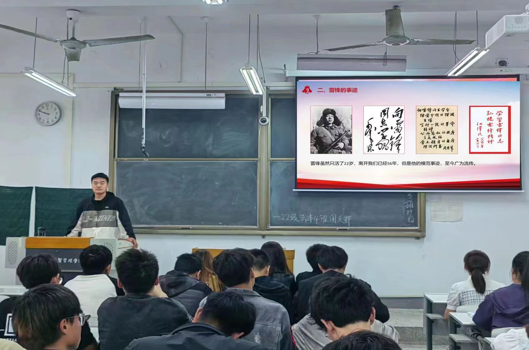 首先,张天超为同学们播放了与雷锋精神有关的视频。视频从传承五四精神、当代青年责任等方面进行讲述。通过观看此视频,同学们认识到雷锋精神的时代价值和现实意义。接着,同学们纷纷主动上台分享自己的志愿服务经历,有的同学擦拭公共电车充电桩,有的同学为社区老人提供心理疏导,有的同学深入社区为居民解答法律问题……大家的经历彰显了青年大学生的风采,是雷锋精神的传承和发扬。最后,张天超联系实际生活,以北京大学药学院2017级直博生黄雨佳的故事为例,号召同学们培养博大的胸怀,发扬奋斗精神,开拓青春事业的新天地。
