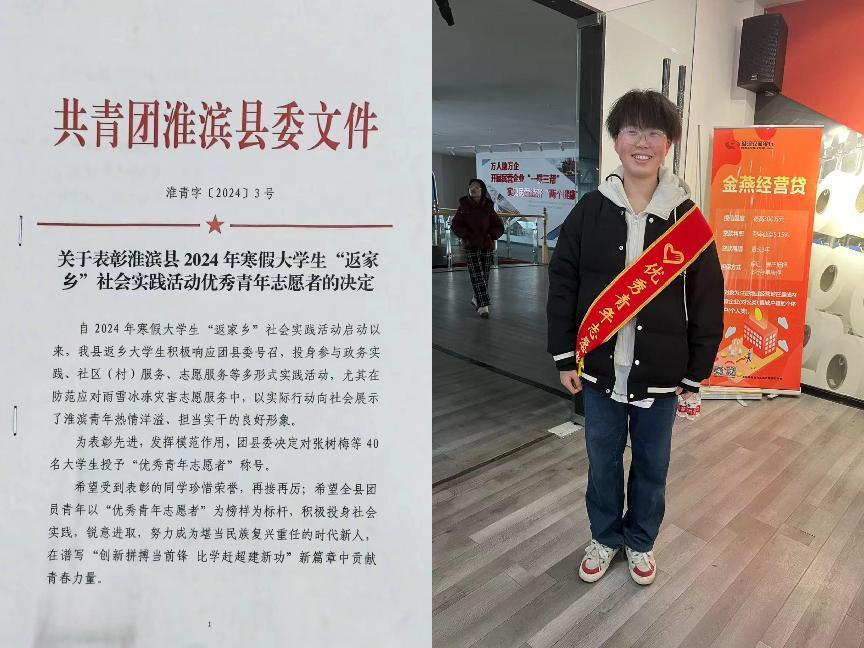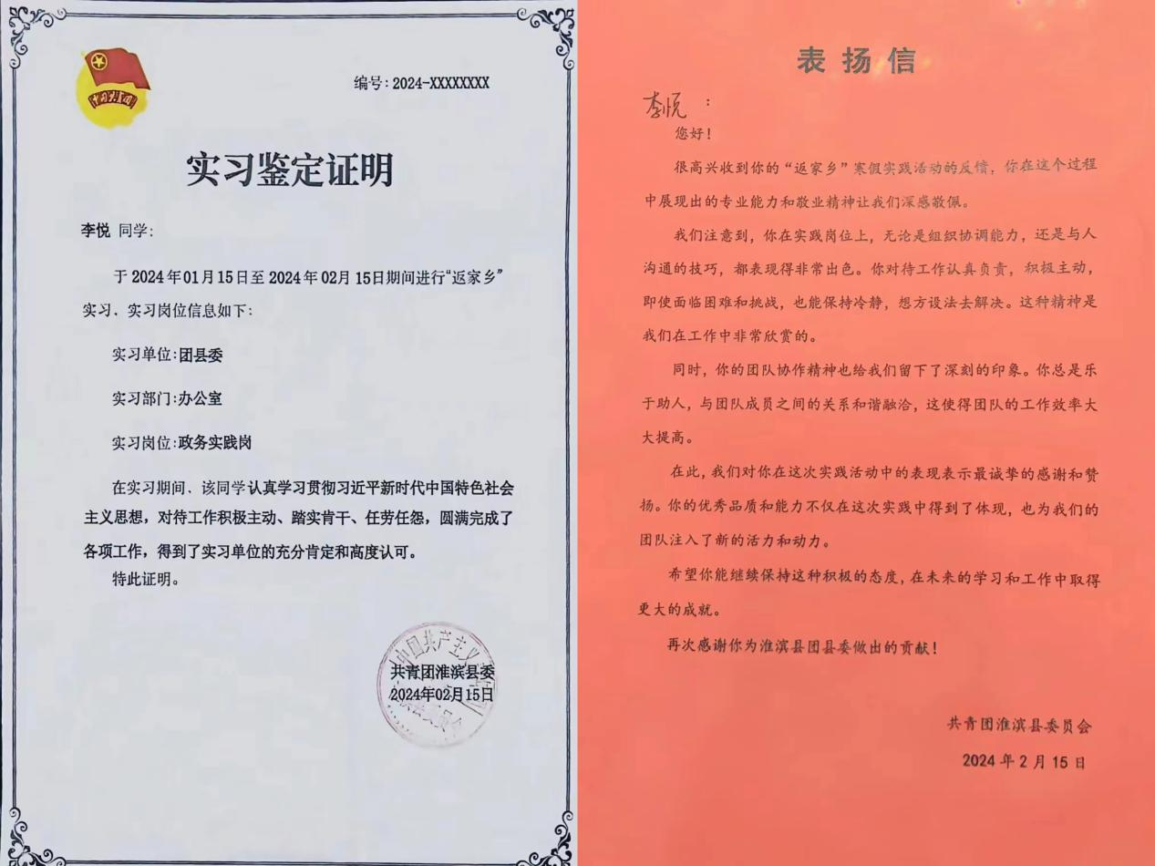 2024年2月,信阳市共青团淮滨县委员会来信感谢华亿体育登录文法学院2023级汉本一班李悦同学,表扬了她在寒假期间积极投身于“返家乡”社会实践活动的先进事迹并为李悦同学发放志愿服务证书。