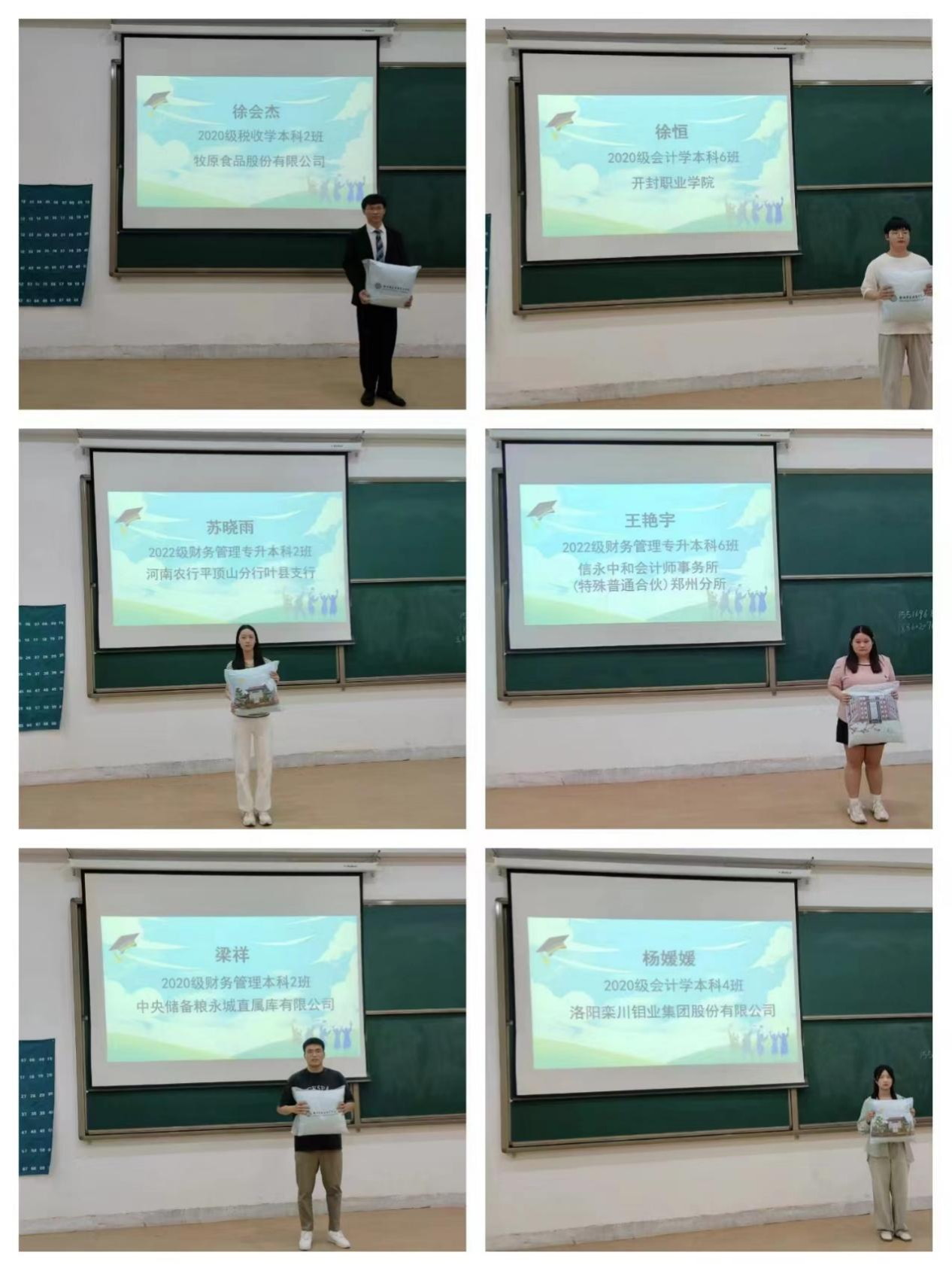 为了帮助会计学院在校生了解就业市场,树立向上、向前、求知的信念,会计学院于6月5日19:20在教学楼四号楼118教室举行了欢送毕业生系列活动——个人职业发展规划经验交流会。出席本次交流会的优秀就业典型毕业生有2020级会计学本科4班杨媛媛,2020级会计学本科7班胡新宇,2022 级财务管理专升本科 6 班王艳宇,2022级财务管理专升本科2班苏晓雨,2020级税收二班的徐会杰,2022级财务管理升本三班张柏杨,2020级会计学本科6班徐恒,2020级财务管理本科2班梁祥。