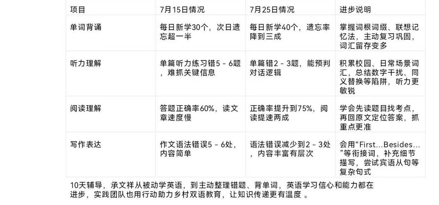 在乡村教育发展进程中,基层地区优质英语教育资源匮乏问题突出,不少学生可能缺乏专业的英语指导。实践团队将系统学习方法、标准发音及先进语言学习理念带回家乡,为填补当地英语教学短板注入活力,让家乡学生接触到更优质的英语启蒙或进阶辅导,减少因地域差异导致的英语学习差距。对团队成员而言,辅导过程也是自我提升的过程。在梳理知识、讲解内容的同时,能深化自身对英语的理解,锻炼表达与沟通能力。更重要的是,通过切实帮助到家乡的孩子,能感受到强烈的成就感和归属感,让个人价值在反哺家乡中充分彰显。