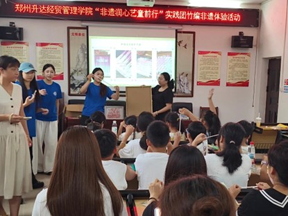 非遗课堂上,队员们先以 PPT 结合图片、视频,为孩子们讲述竹编的悠久历史 —— 从古代生活器具到现代艺术创作,生动讲解让孩子们听得入神,不时举手提问,对这门古老技艺满是好奇。