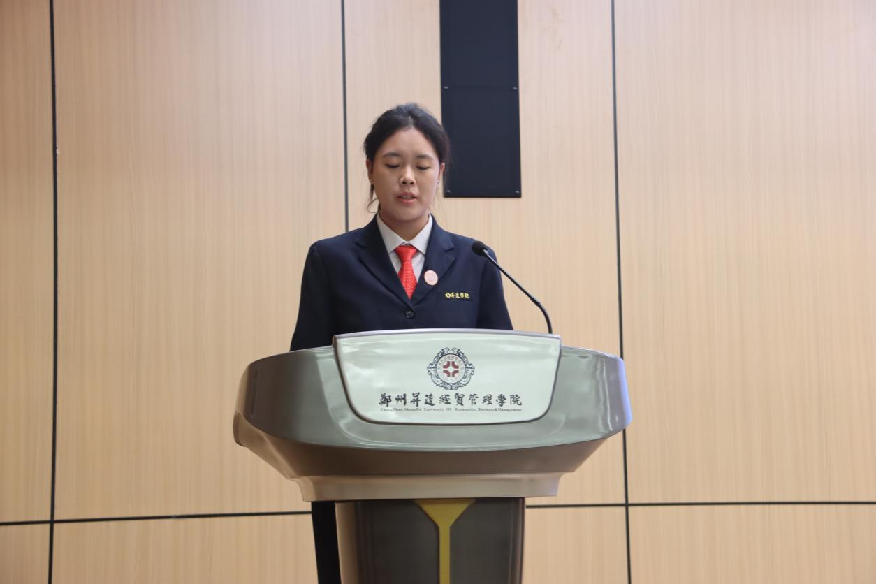 “力行班”第八期学员代表王家瑞发言,她代表新学员对学校搭建学习平台表示感谢,强调将以“力行”为方向,在理论学习中碰撞先进思想,在实践中锤炼实干本领,与同学互学互鉴、协同配合,努力成长为政治坚定、德才兼备的新时代青年骨干,不负“青马人”的责任与使命。