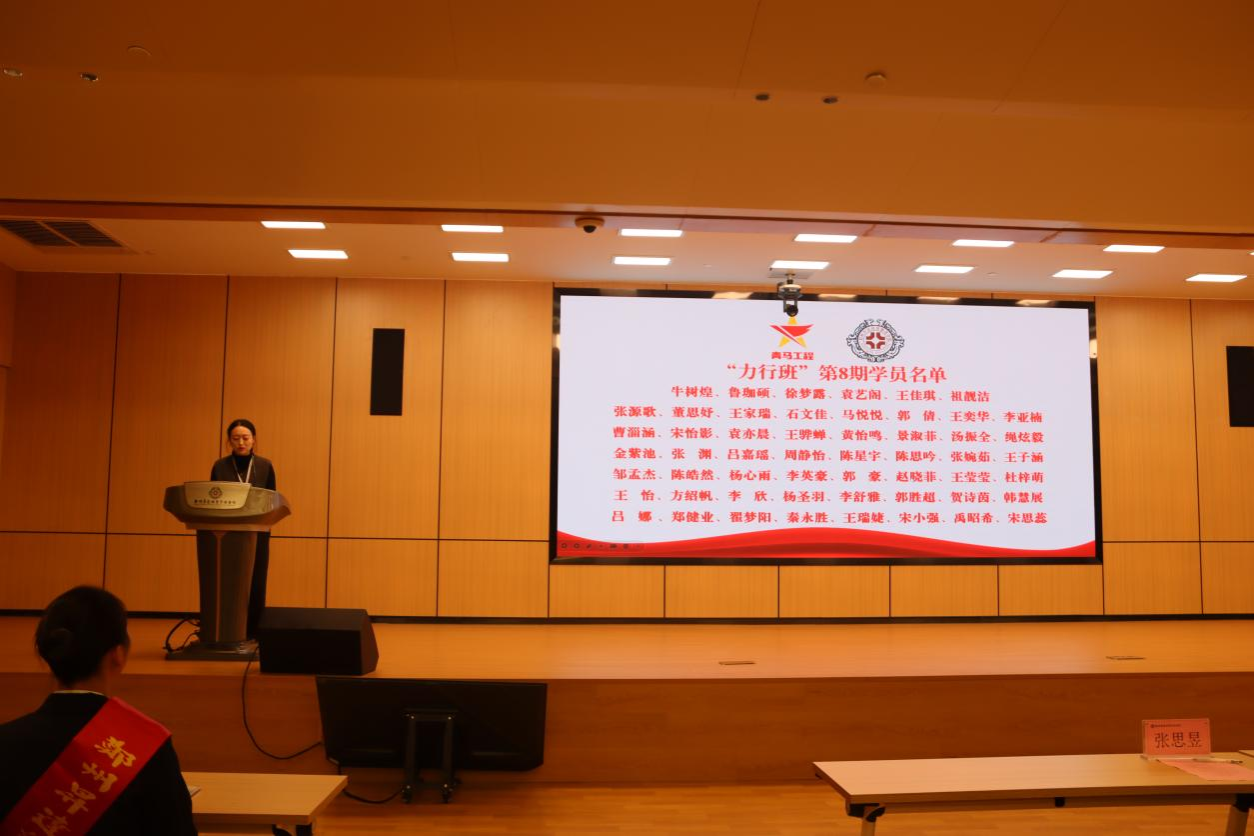 国歌奏毕,校团委组织部部长张思昱宣读“力行班”第七期结业学员名单、“力行班”第八期学员名单及“艺文实验班”第一期学员名单,为过往学习成果作总结,也为新学员的成长征程拉开序幕。