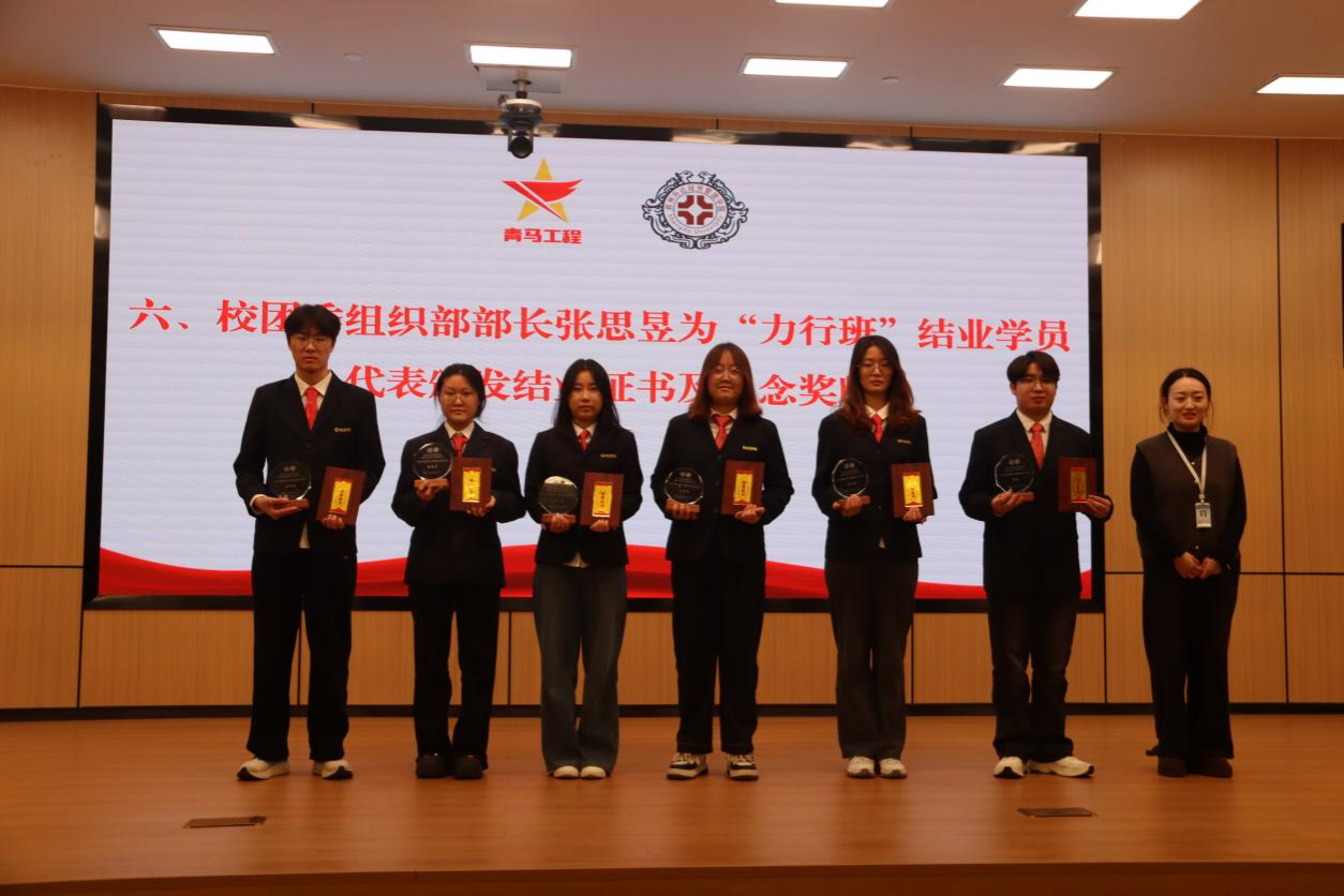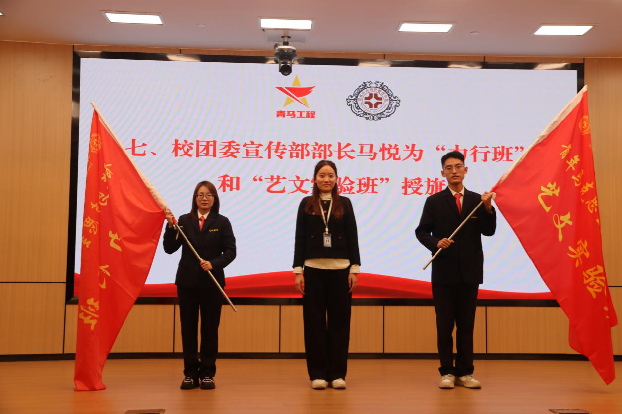 发言环节结束后,仪式进入表彰与授旗环节。校团委组织部部长张思昱为“力行班”第七期优秀结业学员代表颁发结业证书及纪念奖牌,见证学员们的成长收获;校团委社团管理部部长马悦分别为“力行班”第八期与“艺文实验班”第一期授旗,旗帜挥舞间,传递着责任与期望,也标志着两个班级正式启动培养工作。