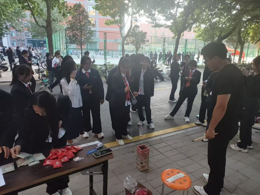 本次活动内容丰富多彩,包括投壶活动、猜谜活动以及抽奖活动。在投壶活动现场,同学们纷纷摩拳擦掌,跃跃欲试。一支支箭羽在空中划过优美的弧线,落入壶中,引来阵阵喝彩。猜谜活动区域同样热闹非凡,一个个妙趣横生的谜语悬挂在彩带上,同学们或驻足思考,或相互讨论,沉浸在解谜的乐趣中。而抽奖活动更是将现场气氛推向了高潮,丰厚的奖品让同学们充满期待,每一次抽奖结果的公布都伴随着惊喜的欢呼。