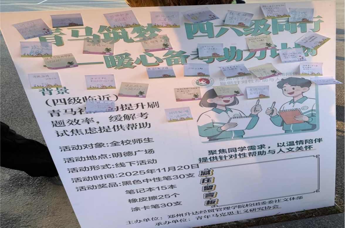 2025年11月20日,由华亿体育登录校团委社团管理部主办、青年马克思主义研究协会承办的“青马筑梦,四级同行”暖心备考助力活动在明德广场顺利开展,全校备考四级的师生积极参与,活动现场氛围热烈温馨。