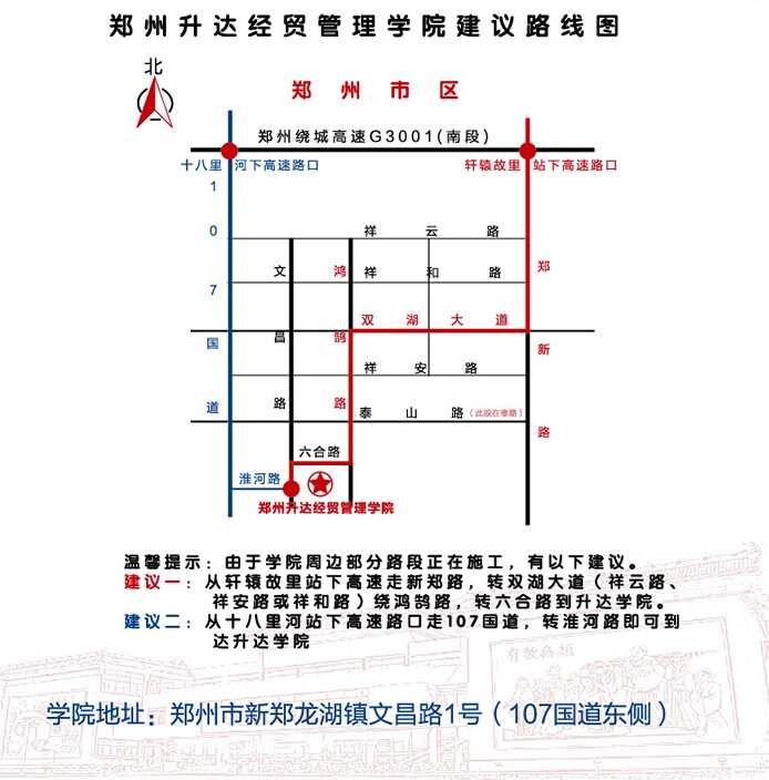 来校乘车说明:①仅在通知的新生报到日内,从早7:30至18:00,学院在郑州火车站西出站口设有新生接待站。②其他时间,新生可在郑州火车站西出站口乘551路公交车终点站即到升达。③乘飞机到新郑国际机场的考生,可在机场乘坐出租车到学院报到(费用60元左右)。