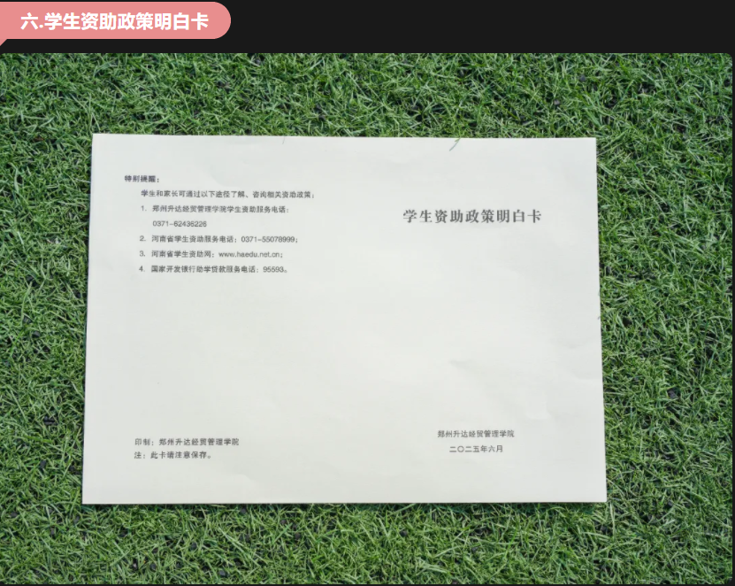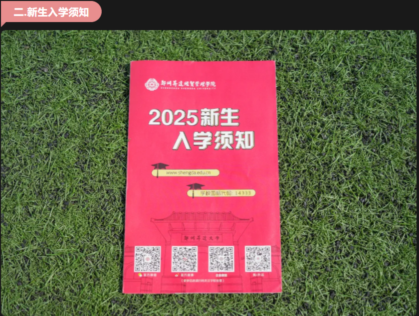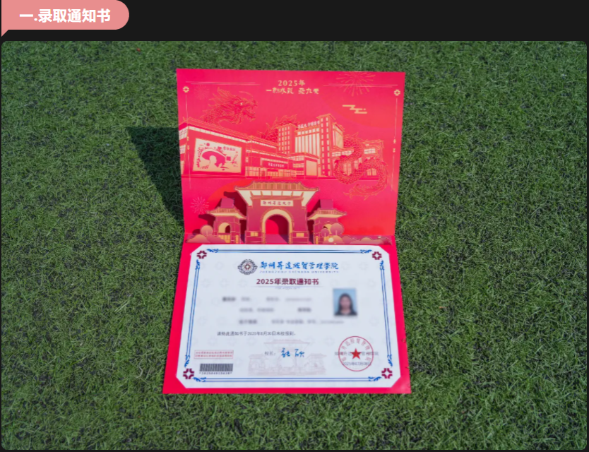 1、录取通知书;2、新生入学须知;3、河南省家庭经济困难学生认定申请表;4、河南省高校本专科学生资助政策简介;5、学生资助政策明白卡;6、大学生应征入伍宣传单;7、河南省大学生宗教政策法规明白卡。