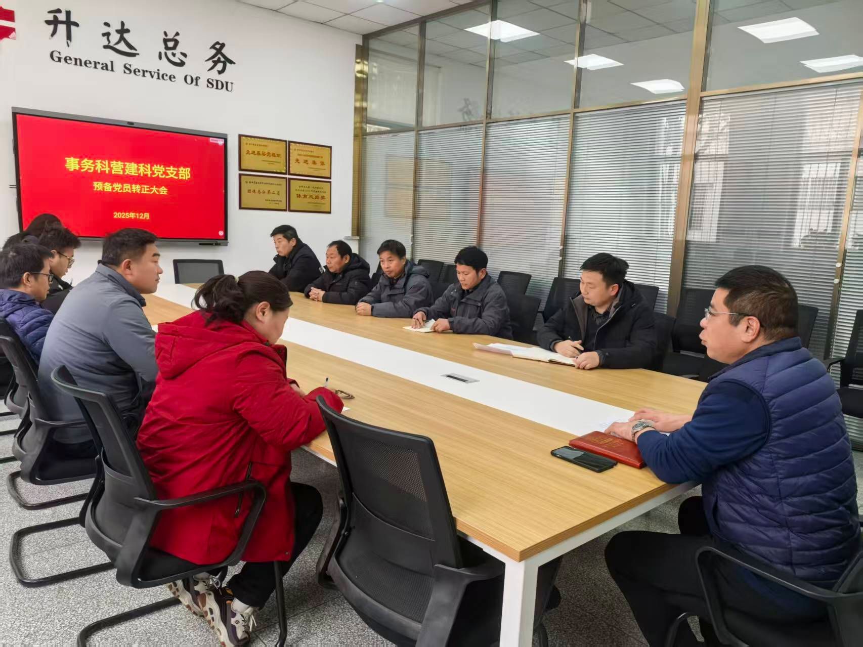 2025年12月30日,事务科营缮科党支部在总务处会议室召开全体党员大会,主要讨论并表决预备党员潘耀宾同志申请转为正式党员事宜。会议由党支部书记虎会飞主持,党支部全体党员参加。